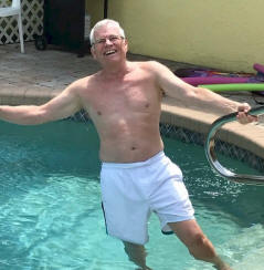 The photo at the left is typical of our morning walk on Manasota Beach. We usually left Bill at a picnic table at the entrance to the Beach and the rest of us walked for miles down the beach. Most evenings we gathered around the table for hours of card games, friendly discussions and enjoyed wine and beer. The photo at the right shows one of our many family dinners outside by the pool with the Earles. Below this is a photo of us in front the Pier at Sharky's Fish House. The Pier is a great place to fish or like we did watch other people fish. We also saw Manatees swimming under the pier on that particular visit. That evening we went back to Manasota Beach to wait for the sunset as shown in the photo at the left. Watching the sunset at Manasota Beach is a big event that usually attracts a few hundred visitors. Before the Earles visited we had other visitors. Rita and Ray Russell stopped by to visit us a couple of times. They were renting a condo in Siesta Keys so we were relatively close by. The photos below also show our friends Pat and Larry